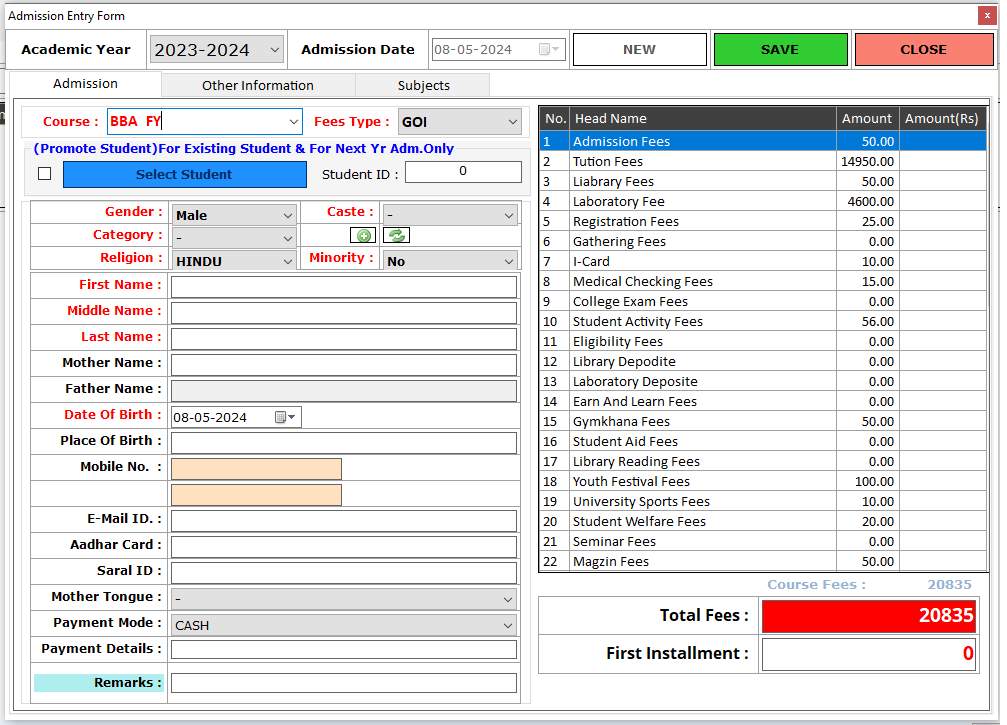 Step 2. New Admission बटण वर क्लिक केल्यावर ऍडमिशन एन्ट्री फॉर्म ओपन होईल . ऍडमिशन एन्ट्री फॉर्म ओपन झाल्यावर NEW या बटण वर क्लिक करावे .