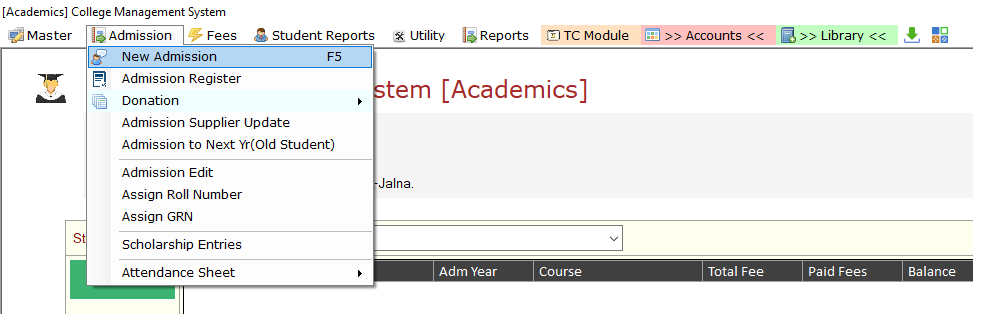 Step 1. Admission या मेनू वर क्लिक करा , नंतर New Admission वर क्लिक करावे.
